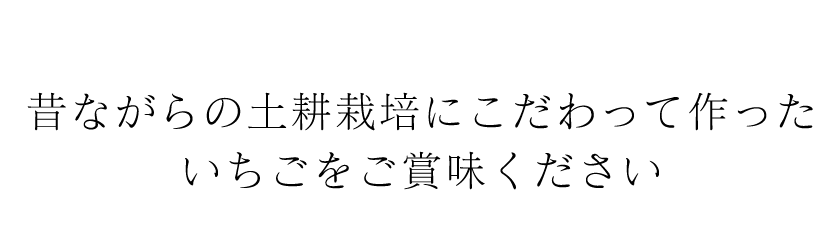 近年、いちごといえば水耕栽培や高設養液土耕栽培などの栽培方法が確立されています。ですが「甘くて美味しいイチゴを作りたい」その想いから、昔ながらの土耕栽培にこだわって栽培しています。 毎年、畝くずしをしいて、土づくりにこだわり、東御の大地で育った土耕いちごをご賞味ください。